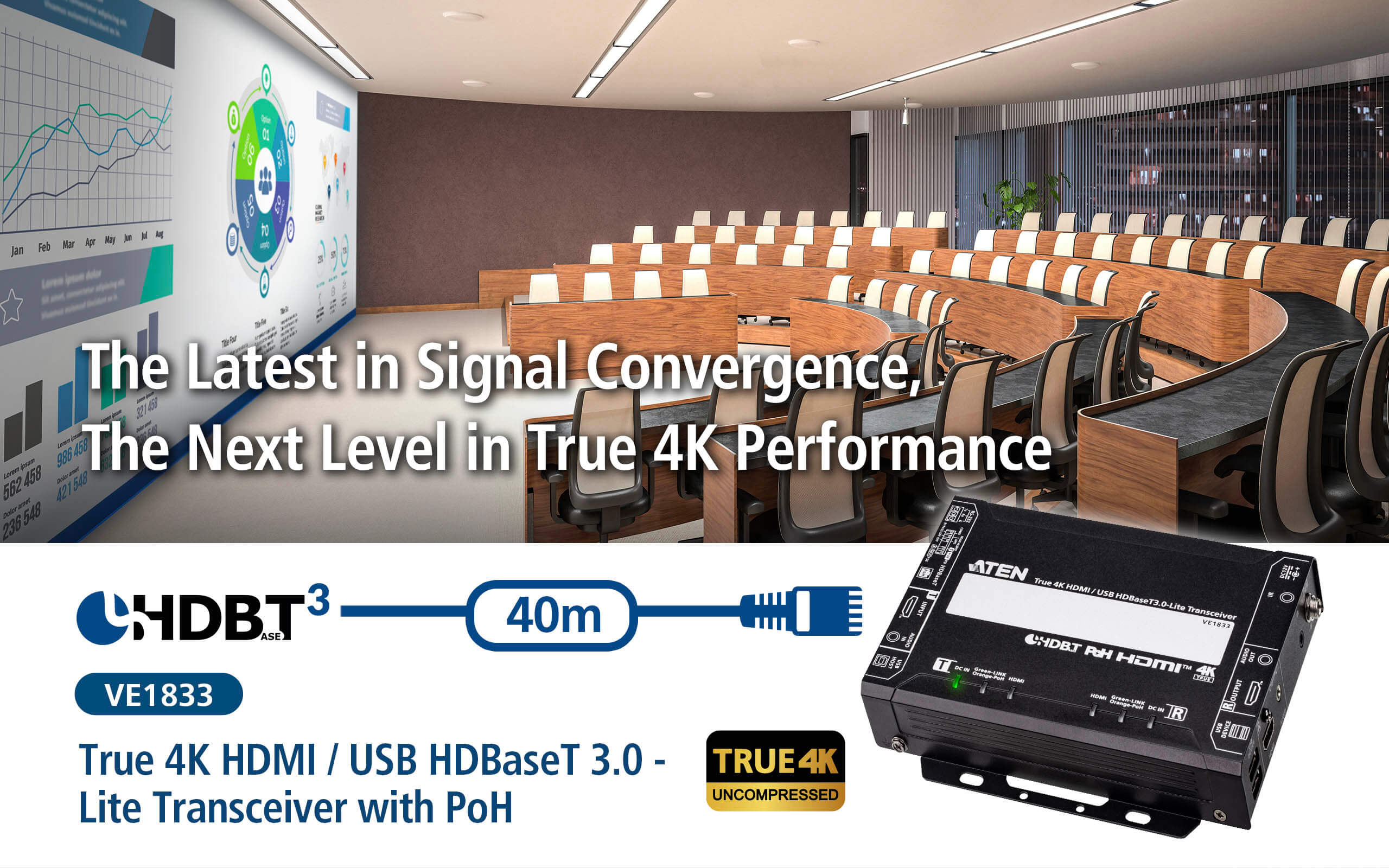 The ATEN VE1833 True 4K HDMI / USB HDBaseT 3.0 - Lite Transceiver with PoH integrates both transmitter and receiver functions in one compact unit, allowing users to flexibly configure it through a DIP switch according to diverse AV setup. Leveraging HDBaseT 3.0 technology, the VE1833 delivers uncompressed True 4K HDMI signals over distances up to 40 m via a single Cat 6a cable (HDBaseT 3 Certified Cat 6a U/FTP / ATEN's tailor-made HDBaseT cable*).