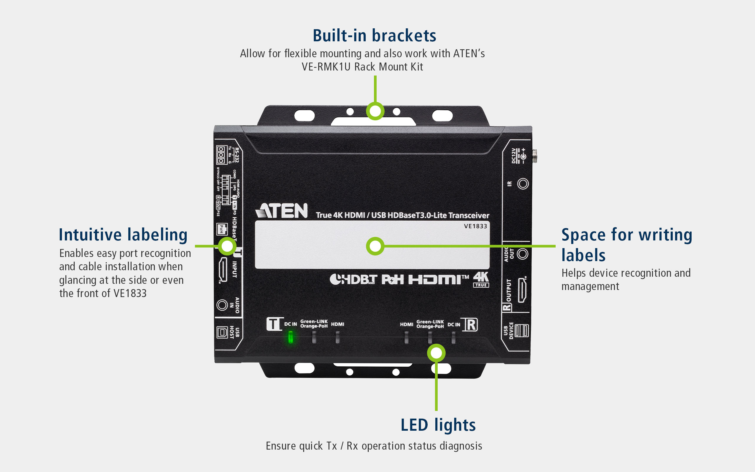 The design of VE1833 elevates its ease-of-use, including the self-explanatory labeling for intuitive port recognition,the built-in brackets for easy mounting, the LED lights for quick diagnosis, and a dedicated space on the front for writing labels to help device recognition / management.